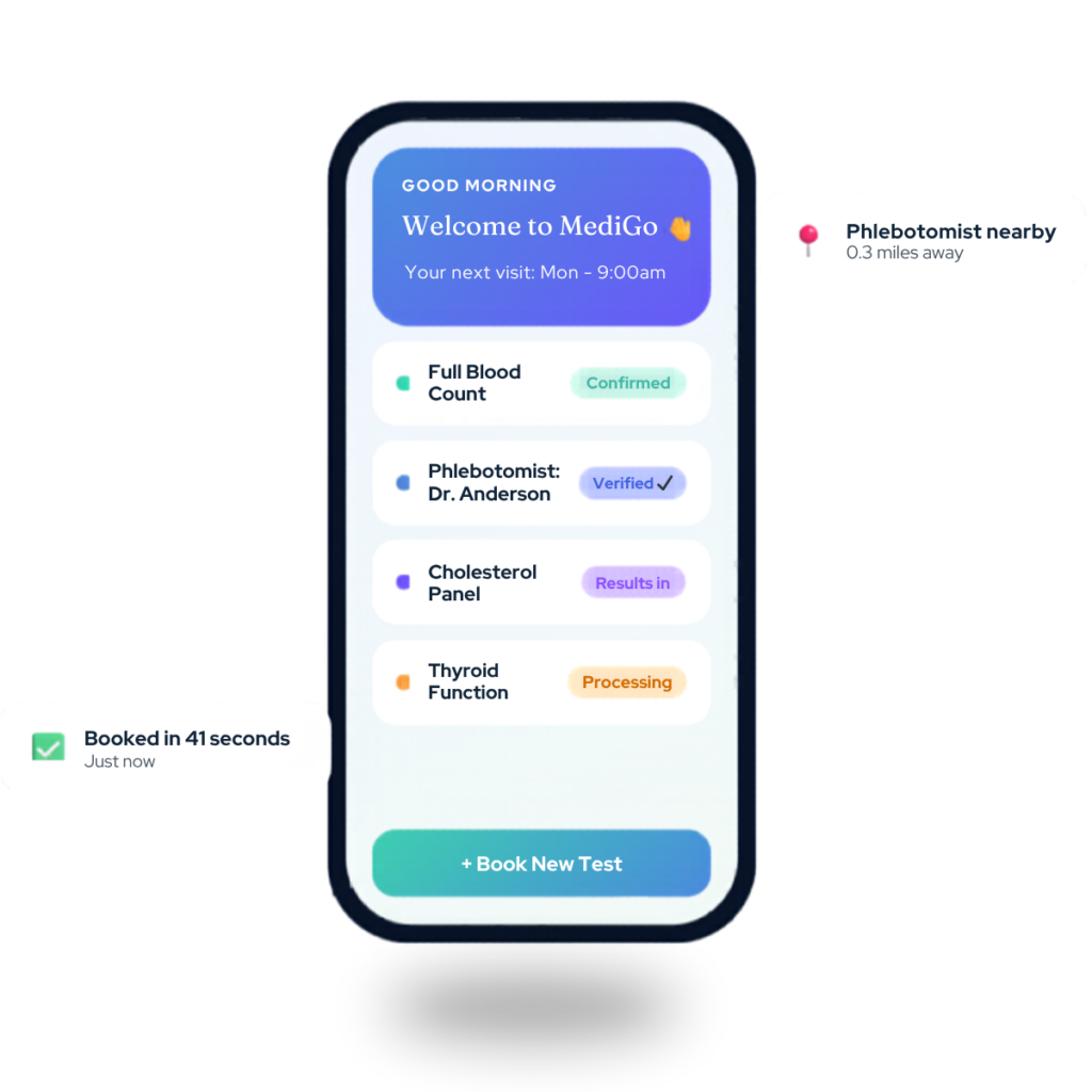 Medigo connects you with trained, vetted phlebotomists who come directly to you — at home, at work, or wherever suits you best.